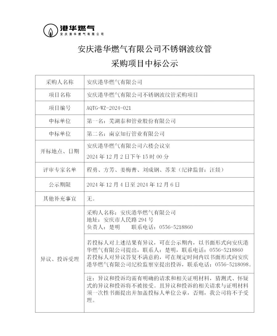 安慶港華燃氣有限公司不銹鋼波紋管采購項目中標公示