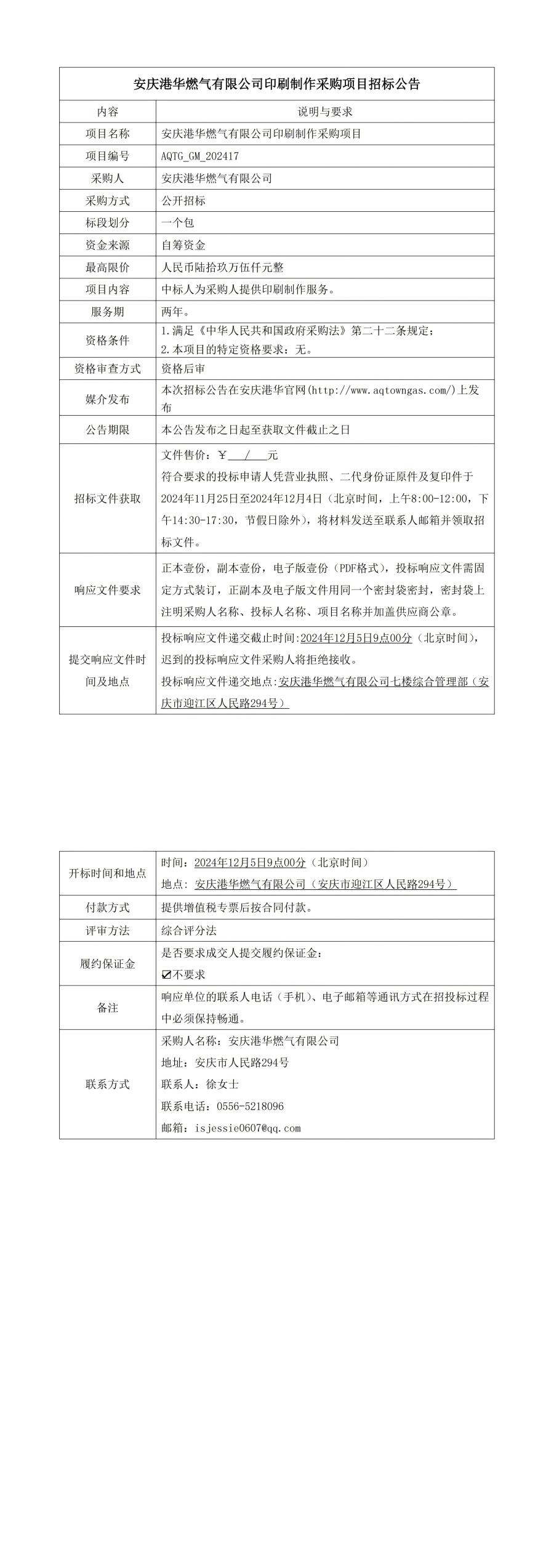 安慶港華燃氣有限公司印刷制作采購項目招標(biāo)公告