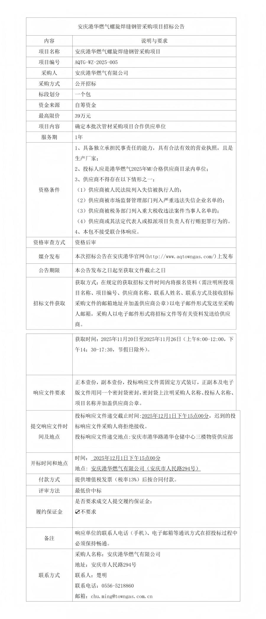 安慶港華燃氣螺旋焊縫鋼管采購項目招標公告