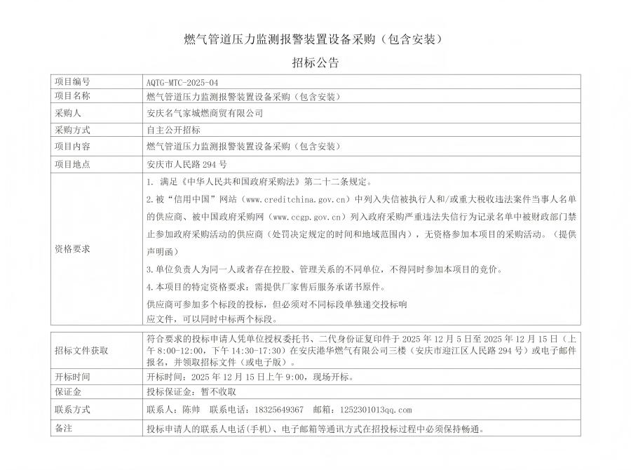 燃?xì)夤艿缐毫ΡO(jiān)測(cè)報(bào)警裝置設(shè)備采購(gòu)(包含安裝)招標(biāo)公告