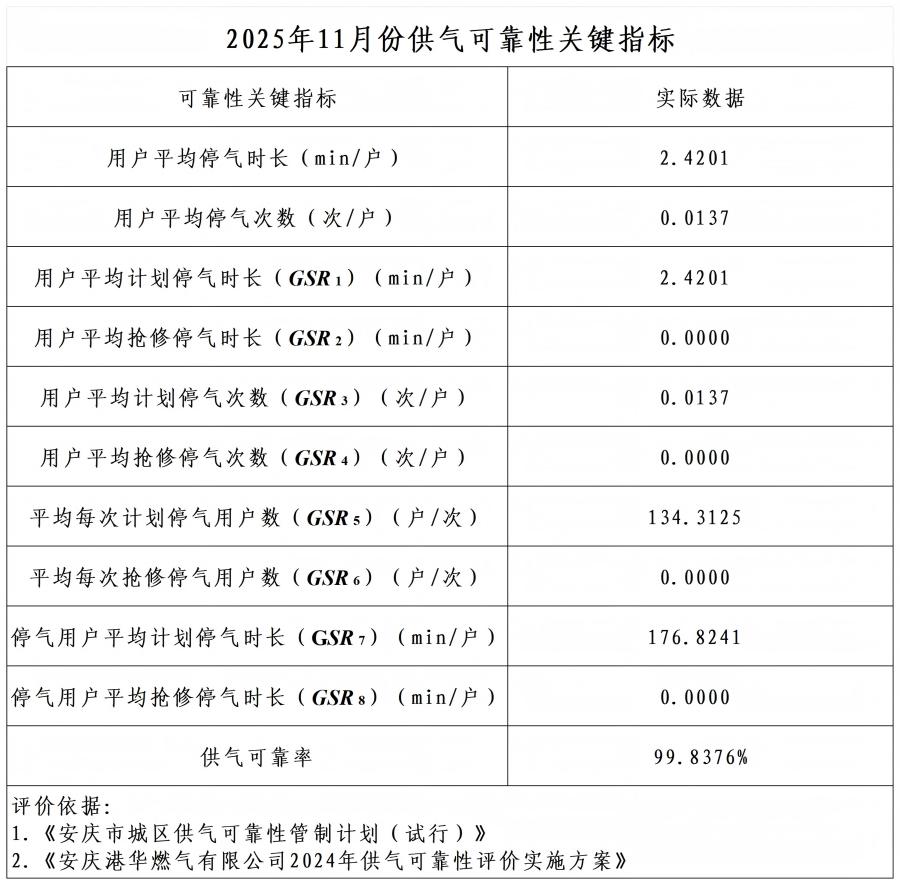 2025年11月份供氣可靠性關(guān)鍵指標