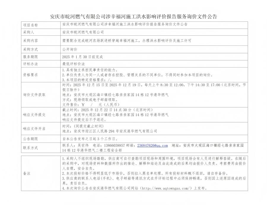 安慶市皖河燃氣有限公司涉辛福河施工洪水影響評價報告服務詢價文件公告