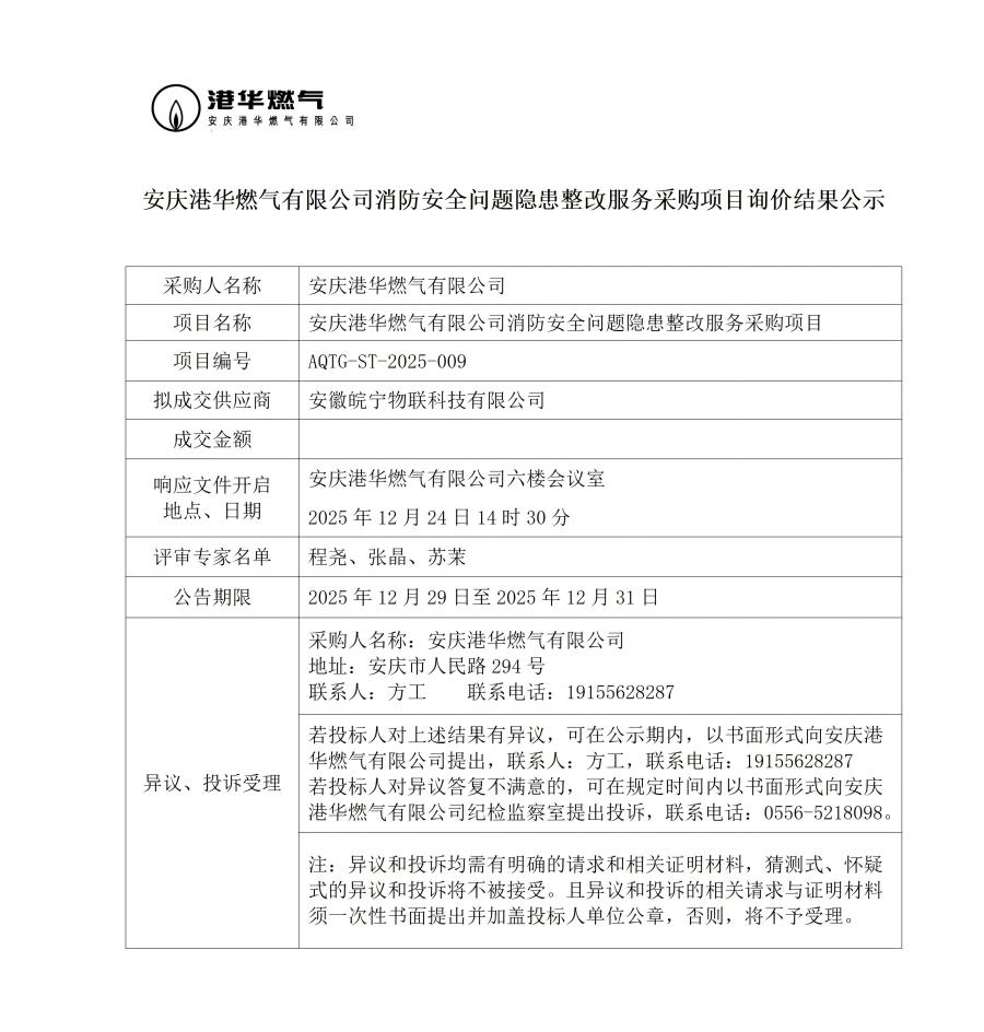 安慶港華燃氣有限公司消防安全問題隱患整改服務采購項目詢價結果公示