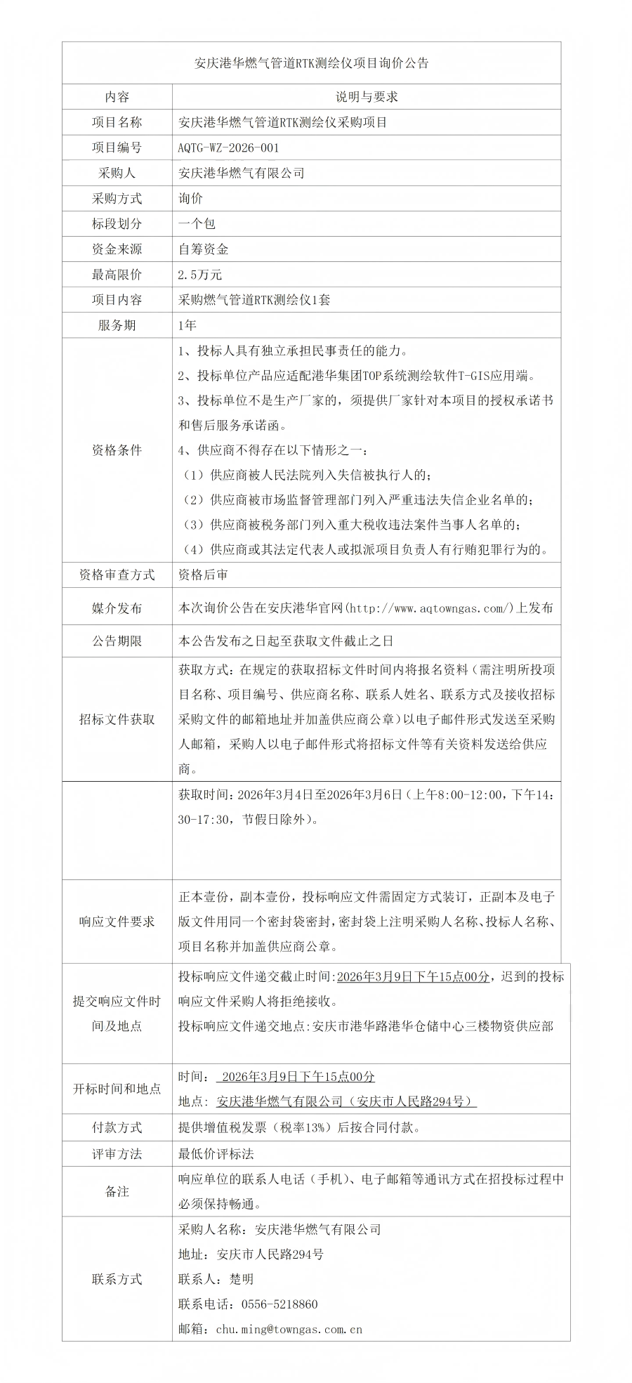 安慶港華燃?xì)夤艿繰TK測(cè)繪儀項(xiàng)目詢(xún)價(jià)公告